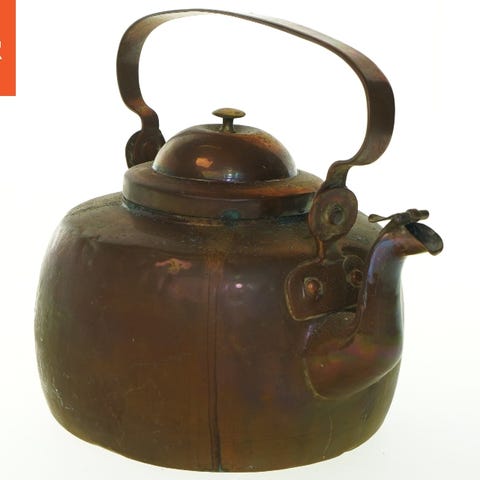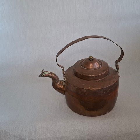 Gammel kedel lavet af kobber med et håndtag og en tud. Kedlen har en rund form med et aftageligt låg og er forsynet med en holder, som gør det muligt at hænge den over en ild. Der er synlig slid og patina over hele overfladen, hvilket indikerer alder og brug.