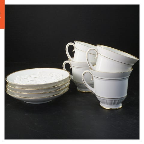 En hvid porcelænsteapot med guldkant og dekorative detaljer. Tepotten har et rundt låg med et lille greb øverst, og et buet hank samt tud. Der er synlige brugsspor, herunder misfarvning på guldtrimmen og nogle mærker på porcelænet.