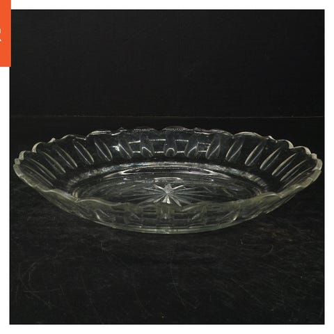 Dette er et gennemsigtigt glasfad med et indgraveret blomstermønster i bunden. Fadet har synlige revner og skræmmer, som tyder på at det er blevet kraftigt brugt eller, at det har lidt et slag.