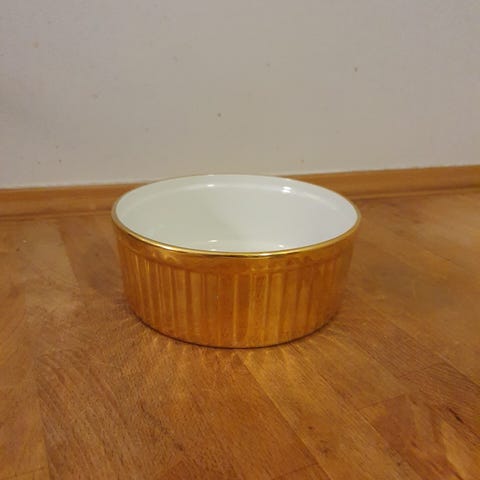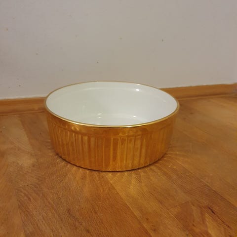 Denne skål er dekoreret med et motiv af kyllinger og blomster. Den er lavet af porcelæn og har en lysegrøn kant. Bunden af skålen har nogle inskriptioner, herunder et nummer. Skålens diameter er 26,3 cm.