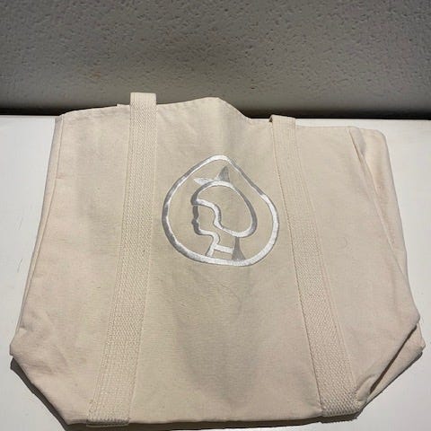 Beige stof mulepose med håndtag. På forsiden er der trykt et logo i hvidt. Størrelsen er 37x52 cm, hvilket gør den praktisk til daglige gøremål. Posens materiale og design giver den et afslappet og alsidigt udseende.