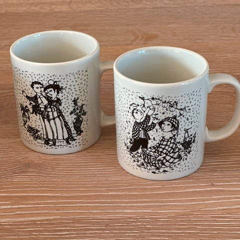 Et keramikkrus med et sort/hvidt motiv af to personer under en paraply. Kruset har en størrelse på 9,5 cm og har en robust hank. Der er trykt mærke på bunden af kruset.