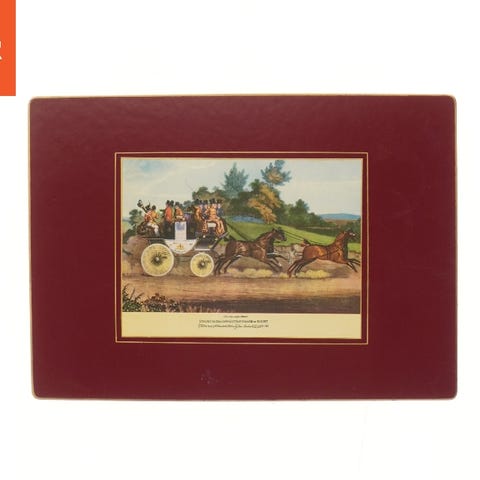En dækkeserviet med motiv af en jagtscene. Den har en bord med bordeaux farve og en maleri af heste og vogne. Bagsiden af servietten er lavet af kork. Dækkeservietten måler 25,5x35,5 cm. Egner sig til brug som bordbeskyttelse under måltider.