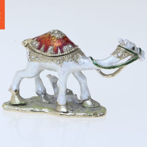 En lille keramikfigur formet som en kat, dekoreret med blå og grønne blomsterdesigns på en hvid base. Figuren er cirka 10,5x11 cm i størrelse og har en unik udformning med detaljeret maling.
