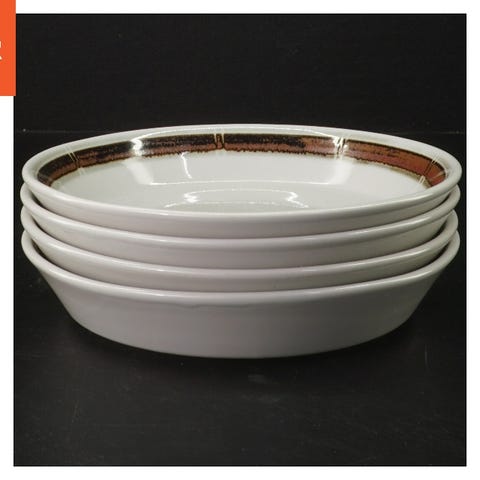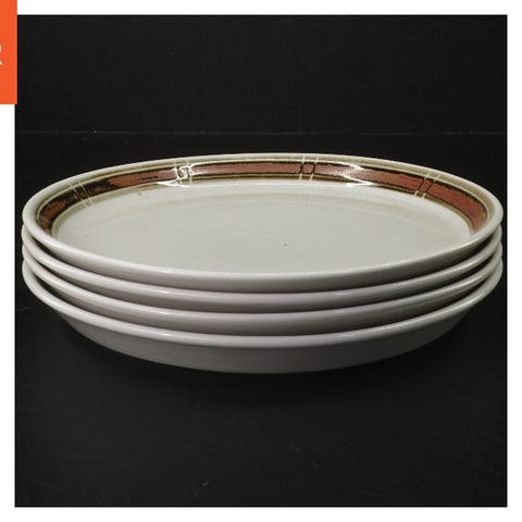 Et sæt af 4 tallerkener med en diameter på 18 cm. Tallerkenerne har et dekorativt kantmønster i brun nuance mod en lysegrå baggrund. De er fremstillet af porcelæn og på bagsiden bærer de mærket 'VEB Haldensleben'. De er ideelle til servering af måltider eller som dekoration på bordet.