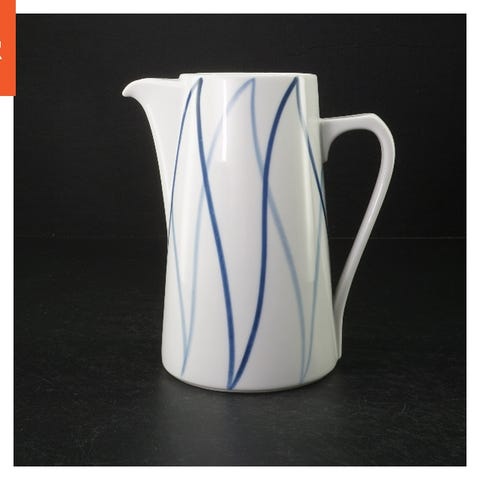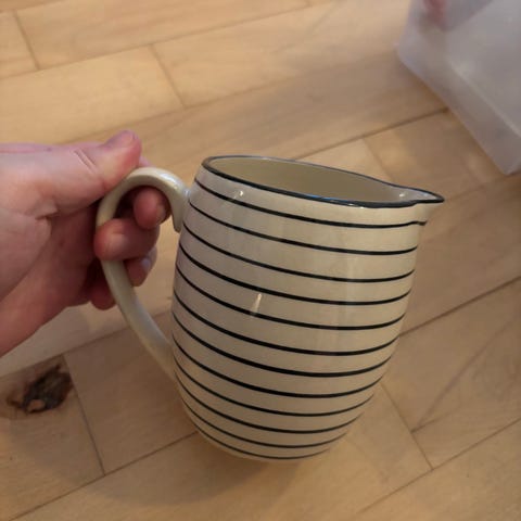 Keramisk mælkekande med brun og hvid farvekombination. Kanden har et klassisk design med en hank og en lille tud for nem hældning. Der er en dekorativ brun kant omkring åbningen samt et mønster omkring bunden. Måler 7 cm i højde. Ideel til servering af mælk eller fløde til kaffen eller teen.