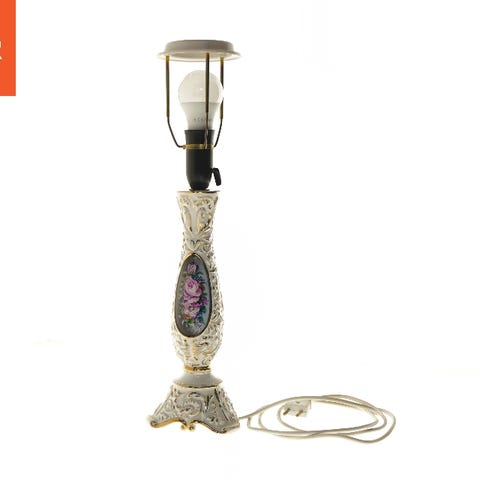 En lille bordlampe med en højde på 23 cm. Lampen har en blå sokkel og en hvid fatning. Der følger en ledning med kontakt og stik med lampen. Ideel til små rum eller som dekorativ belysning.