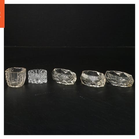 Tre krystal karafler med forskellige geometriske mønstre. De er cirka 13-17 cm høje og har en klassisk design med runde stoppers. Den første karaffel har et diamantmønster, mens de to andre har mere rektangulære linjer i deres design.
