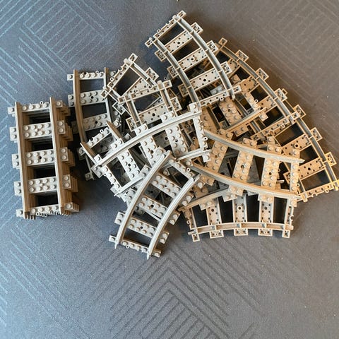 Billedet viser en samling af LEGO dele, hovedsagelig blå togskinner og hvide klodser. Disse komponenter er designet til at bygge togbaner og forskellige konstruktioner. De blå skinner er kurvede og passer sammen med LEGO klodser. Det samlede sæt ser ud til at komme i en original LEGO kasse.