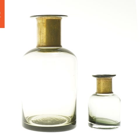 Disse glasflasker kommer i to størrelser: 23,5 cm og 11 cm. De har en klar glaslegeme med en messinghals, der tilføjer et elegant touch til deres design. Flaskerne er velegnede til dekoration eller opbevaring af små genstande.