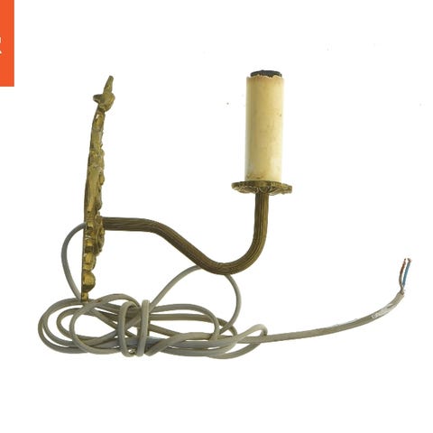 Dette er en vintage industriel væglampe med en klemmebeslag. Lampen har en konisk skærm og er forbundet med ledninger, der kan ses tydeligt. Den har en metalkonstruktion og en trækomponent ved monteringspunktet. Lampen måler Ø 12x40 cm og er beregnet til brug i indretning hvor der ønskes et rustikt look. Den har en guldfarvet ledning med en to-benet stikprop.