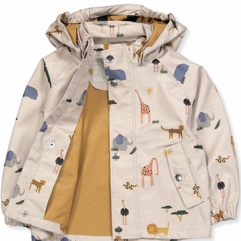 Jakken har knaplukninger og lynlås for nem på- og aftagning samt aftagelig hætte med “ ører” .