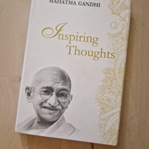 Bog med motiv af Gandhi, med sort baggrund og blå illustration og tekst. Omslaget viser et portræt af Gandhi i blå farve.