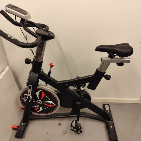 Spinningcykel i rød farve og stålmateriale. Egnet til indendørs træning og konditionstræning.
