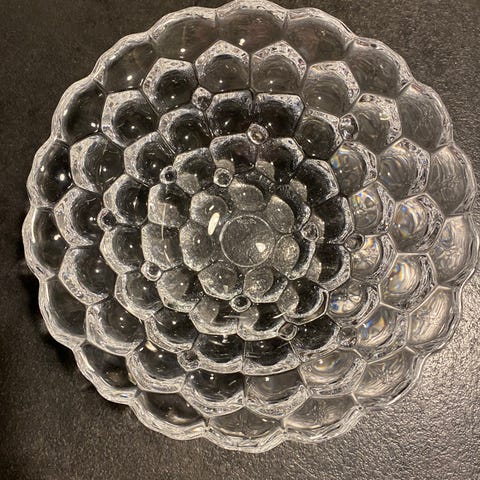 Orrefors glasskål på billedet er designet af Eva Englund og kaldes "Viol"