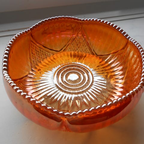 Fin dekorativ gammel skål i presset glas, flot farvespil i den slags glas som kaldes carnival eller amerikansk glas.