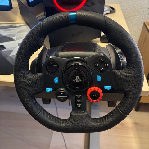 BYD Logitech G Racingrat med pedaler i sort farve. Sættet inkluderer rattets styreenhed med knapper og tre pedaler til spilkontrol.
