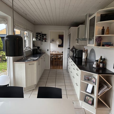 Hvidevarer følger med. Bortset fra opvaskemaskine, er de dog af ældre dato