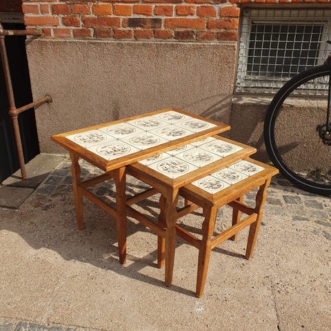 Sæt bestående af tre træborde med fliseplader på toppen. Velegnet som sideborde. Målene er på det største bord.