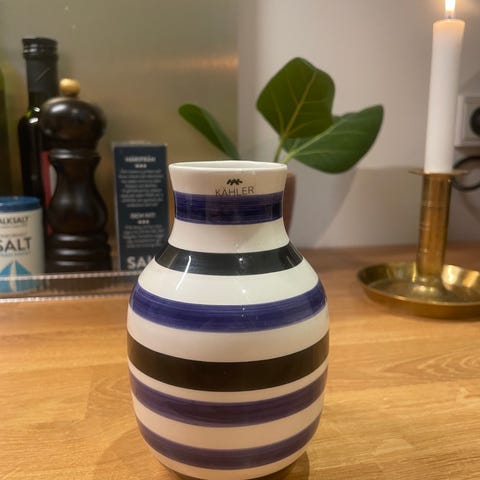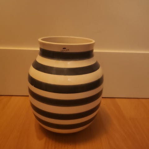 Kähler vase med sølv og hvidt stribet mønster i keramisk materiale. Vasen har en rund form og kan bruges til blomsterdekorationer eller som dekorativ genstand i hjemmet. Højde: 20 cm
