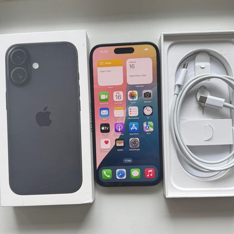 Iphone 16 Plus i sort med 128gb i super god stand batteriet er stadigvæk godt inkl æske og opladerkabek med kvittering.