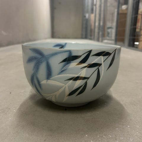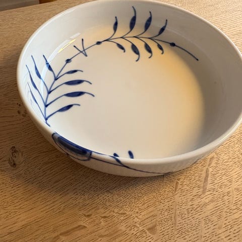 Royal Copenhagen hvid porcelænsskål med dekorative blå og sorte blade.
