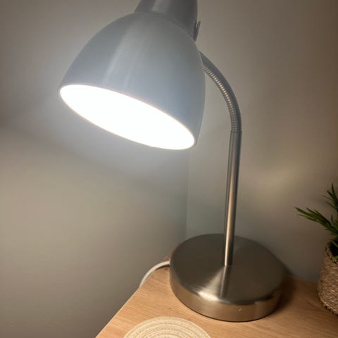 Lampen står solidt og stabilt med en tung fod, så den ikke vælter let. Perfekt som skrivebordslampe, læselampe eller stemningslampe.