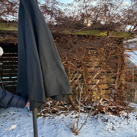 Grå gratis parasol. Syningen er gået lidt i bunden men tråde skal nok bare klippes af. Kom og hent