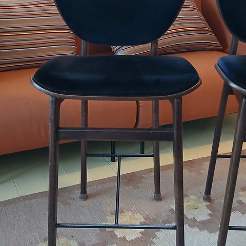 Super fede, enkle og elegante barstole fra Norr11. De hedder Barfly. Sort Stel af pulverlakeret metal og sæde i flot sort formpresset MDF hvor man kan se årernes spil. Har få brugsspor, men står flotte og er helt velfungerende.
