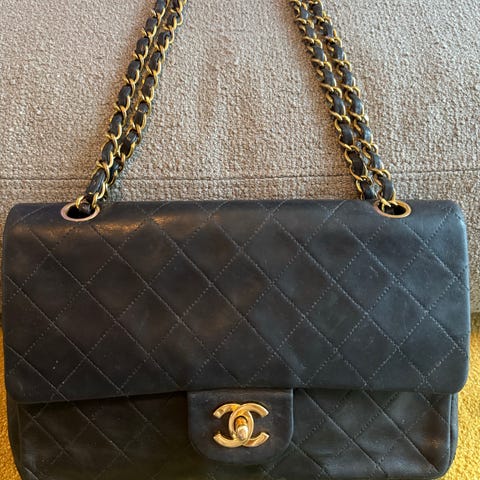 Beige vintage Chanel håndtaske i kalveskind med marmor CC kvaster
