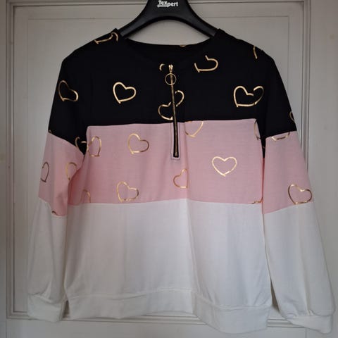Sort, rosa og hvid sweatshirt med guldfarvet hjerter