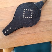 Dette er en norsk, traditionel blæsebælg til pejsen, sandsynligvis fra det 18. eller 19. århundrede, med dekorativt folkekunstmønster.