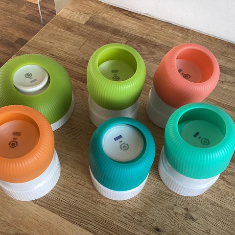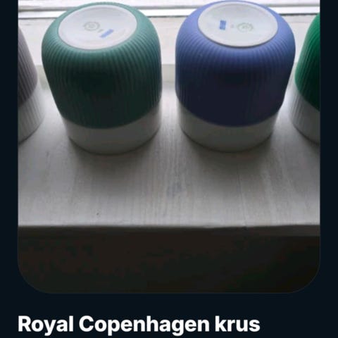 Royal Copenhagen krus i flere farver med rillet overflade. Krusene har en glat, hvid kant og en farvet bund i nuancer som grøn, lilla og grå.