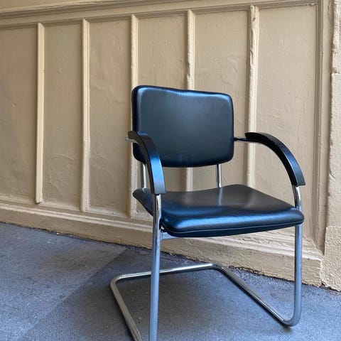 Den klassiske alu stol med blåt sæde og grøn ryg fra Müller van Severen. Brugt, men i fin stand.