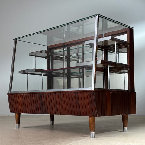 Et yderst dekorativt og funktionelt originalt 1950’er butiksmøbel, som kombinerer æstetik, kvalitet og praktisk anvendelighed.
