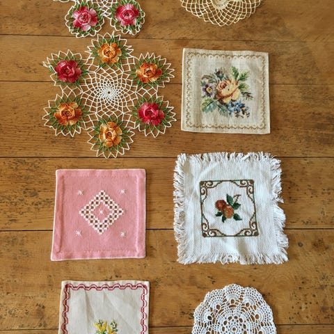 Serviet i tekstil med blomsterprint i grå til korssting broderi. Den kan bruges anvendes som borddækning til forskellige lejligheder.