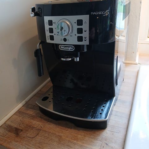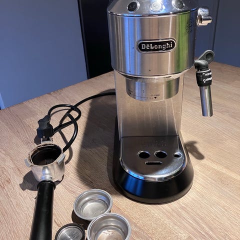 De'Longhi Dedica espressomaskine i rustfrit stål. Maskinen har et kompakt design og inkluderer tilbehør som tamper og mælkeskummer. Velegnet til tilberedning af espresso og cappuccino.