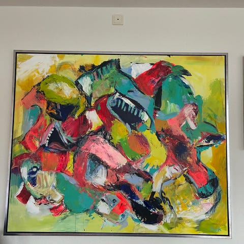 Abstrakt maleri med en farverig komposition bestående af røde, blå, gule og grønne farver. Maleriet indeholder forskellige former og linjer i et ekspressivt udtryk, og personer.