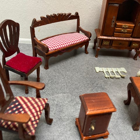 Smukke gamle møbler til dukkehus. Alt i lakeret mørkt træ.