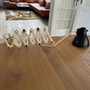 Mørkebrun bakelit skærm på 16cm i diameter og med en smukt patineret sort sakse (længde 110cm i udslået tilstand).