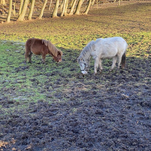Udstyr: sadel, underlag, hovedtøj uden bid og tøjlet, og dækken til dem begge to