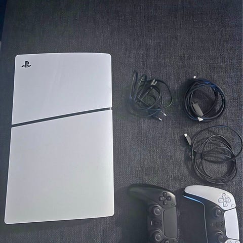 Sælger min PS5 Slim med disk drev. Der medfølger kabler, 2 controllers, plastik stander og 4 spil: