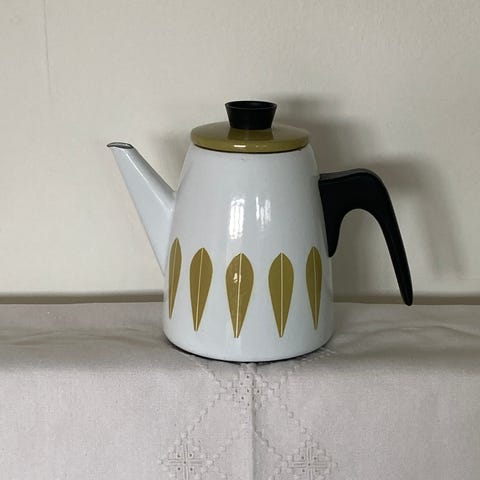 Skøn Lotus te-kande fra norske Cathrineholm. Kanden er designet af Grete Prytz Kittelsen i begyndelsen af 1960’erne. Denne kande fremstår i fin stand udvendigt med få afskalninger og brugsspor. Indvendigt har den noget mere patina og det anbefales, at den anvendes som pyntegenstand.