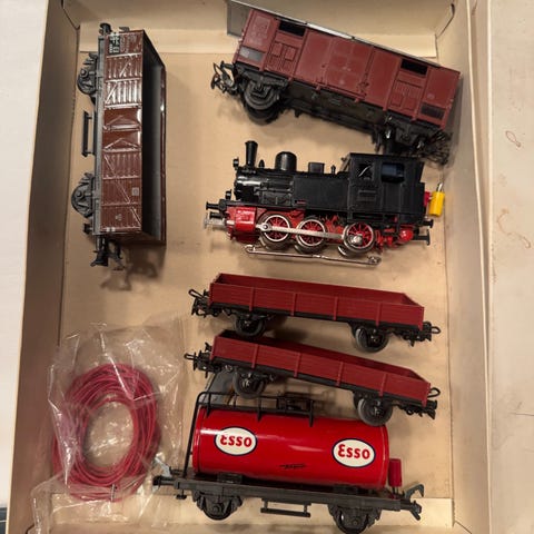 Märklin ICE tog sæt med vognsæt og tilhørende skinner. Toget er designet med hvid, rød og sort farve og består af et førerhus samt flere vogne. Sættet inkluderer 4 lige og 12 buede skinner til modeljernbaneopbygning.