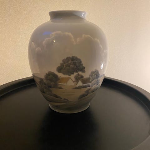 Vase af porcelæn modelleret i relief med julerose, dekoreret i blå og hvid glasur. H. 7 cm, Ø ca. 7,5 cm. Nr. 21-07-20-0013. 1. sort. Effie Hegermann-Lindencrone (1860-1945) for Bing & Grøndahl.