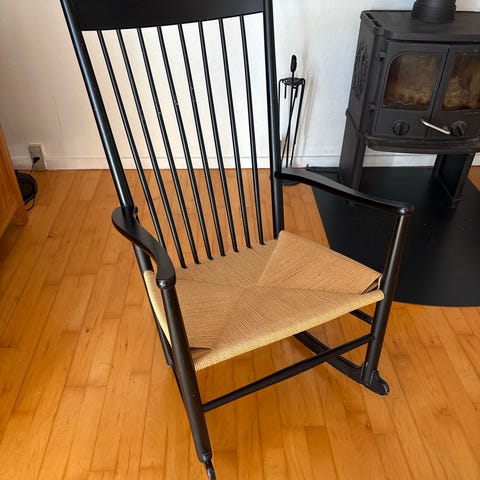 Hans Wegner gyngestol J16 i sæbebehandlet bøg med stofhynder og læder nakkehynde. Det hele fremstår som nyt. Købt hos Ingvard Christensen i 2018.