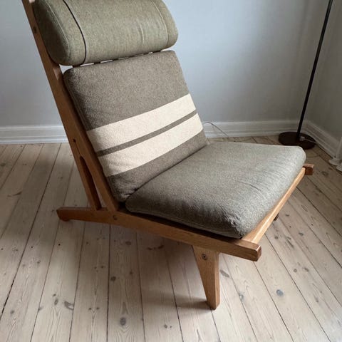 Hans J Wegner GE370 med originalt betræk. Faste gjorde og minimale brugsspor på stolen i massiv egetræ.