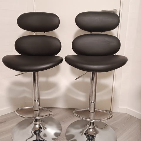 2 stk barstole i sort læderlook med gasstøddæmper og drejelig sæde. Højde på stolene 55-75 cm