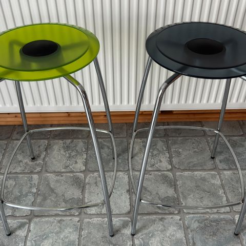 UFO 760 barstole, dansk design fra Hoffi med farverige transparente sæder og et robust stilrent stel i forkromet stål.