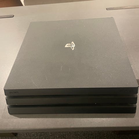 Sony Playstation 4 pro spillekonsol. Sort farve. Designet til spil og underholdning.
